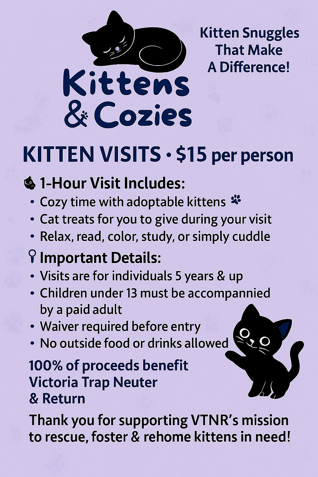 100% of kitten visit proceeds support Victoria Trap Neuter & Return (VTNR) rescue efforts.